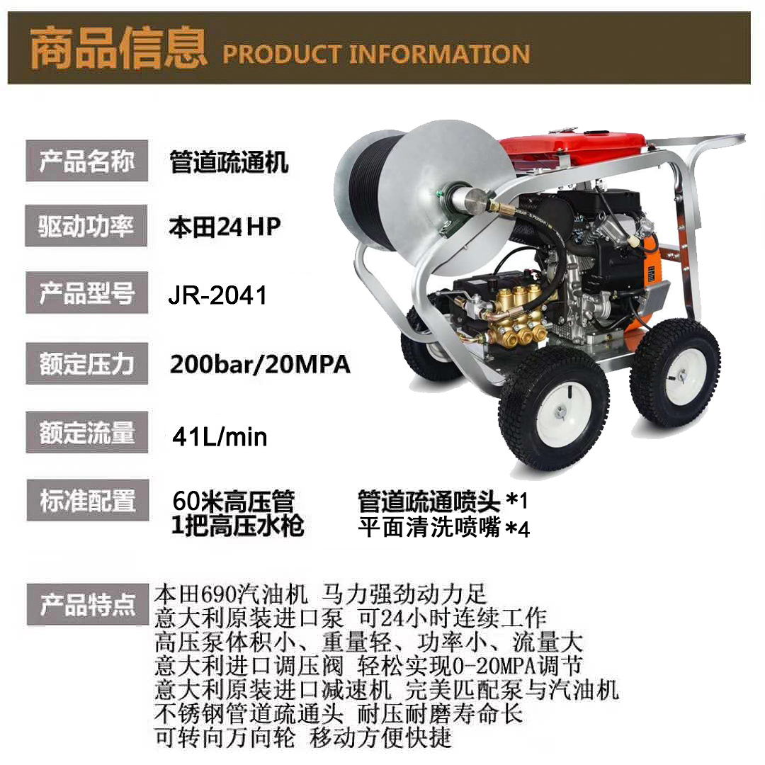 市政環衛高壓清洗機(管道疏通清洗機汽油機)產品型號JR-2041主機功率24P動力能源汽油額定壓力20MPa額定流量41L/Min高壓泵轉速1450r/Min整機重量150KG外形尺寸120*80*70cm移動方式手推式傳動形式變速箱冷卻方式風冷應用領域管道疏通(0-300mm管道)、市政清洗、畜牧業清洗、車間清洗標準配置管道疏通膠管*60米,高壓清洗槍*1把,管道疏通噴頭1個工廠展示: